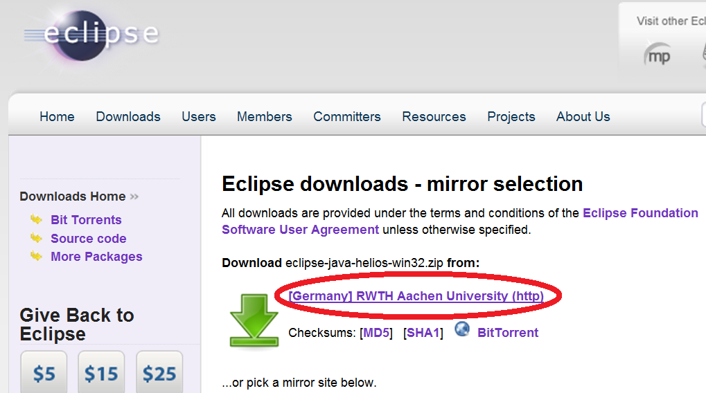 Wählen Sie den Link zum Herunterladen des vorkonfigurierten Pakets "Eclipse IDE for Java Developers". Auch wenn Sie schon ein 64-bit Betriebssystem betreiben, wählen sie bitte trotzdem die 32-bit Version!