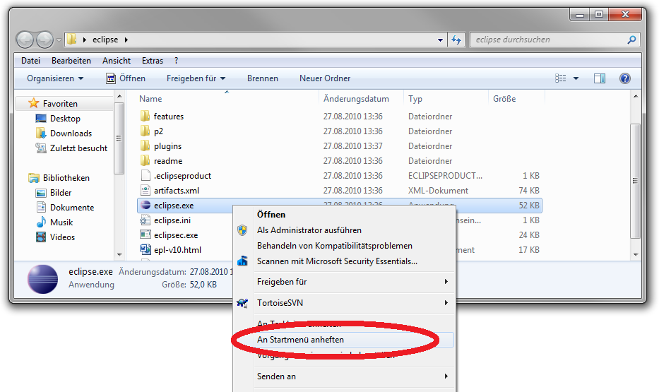- Auf einem Windows-System können sie sich die spätere Arbeit vereinfachen, indem Sie das Programm "eclipse.exe" in das Startmenü aufnehmen.